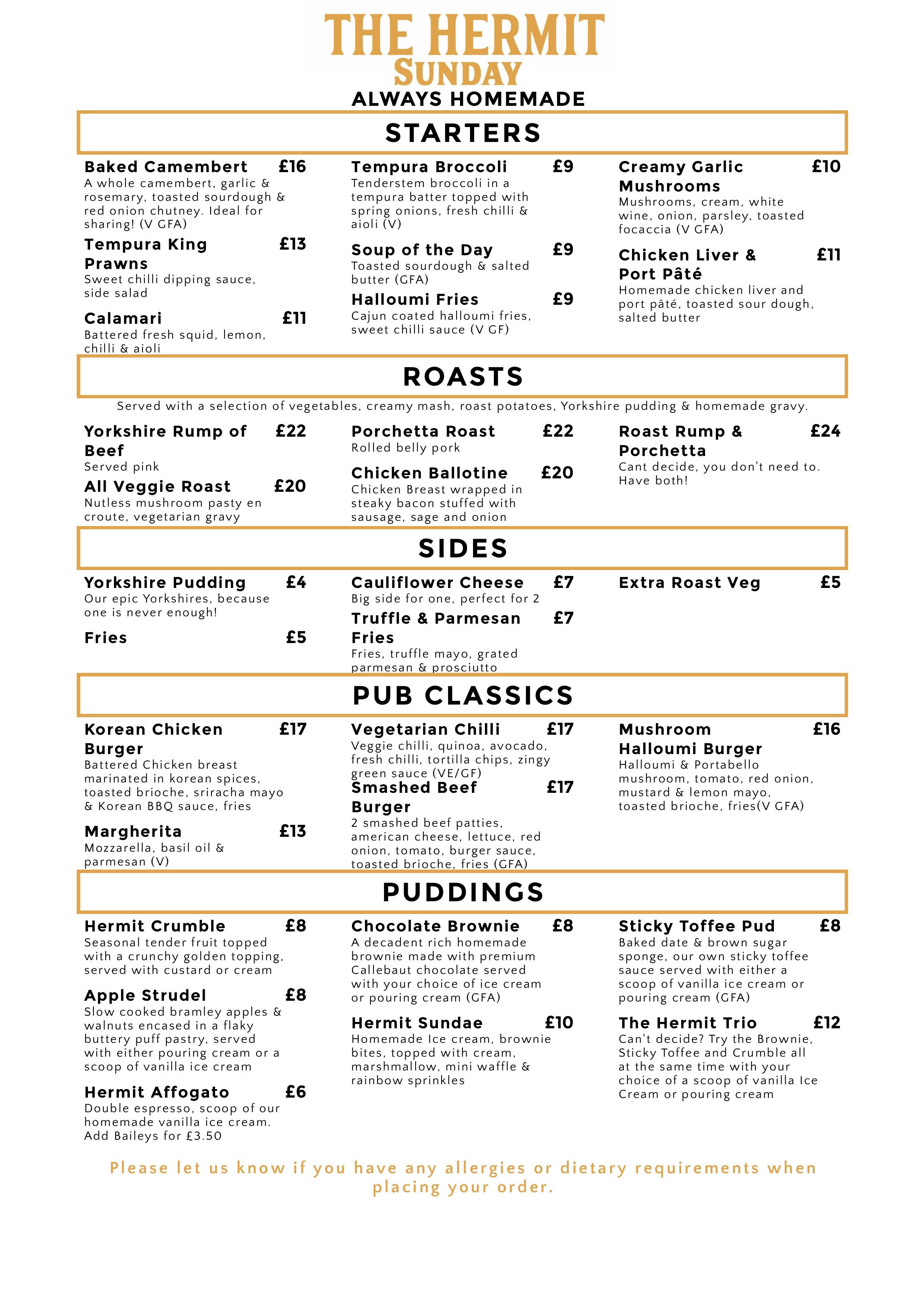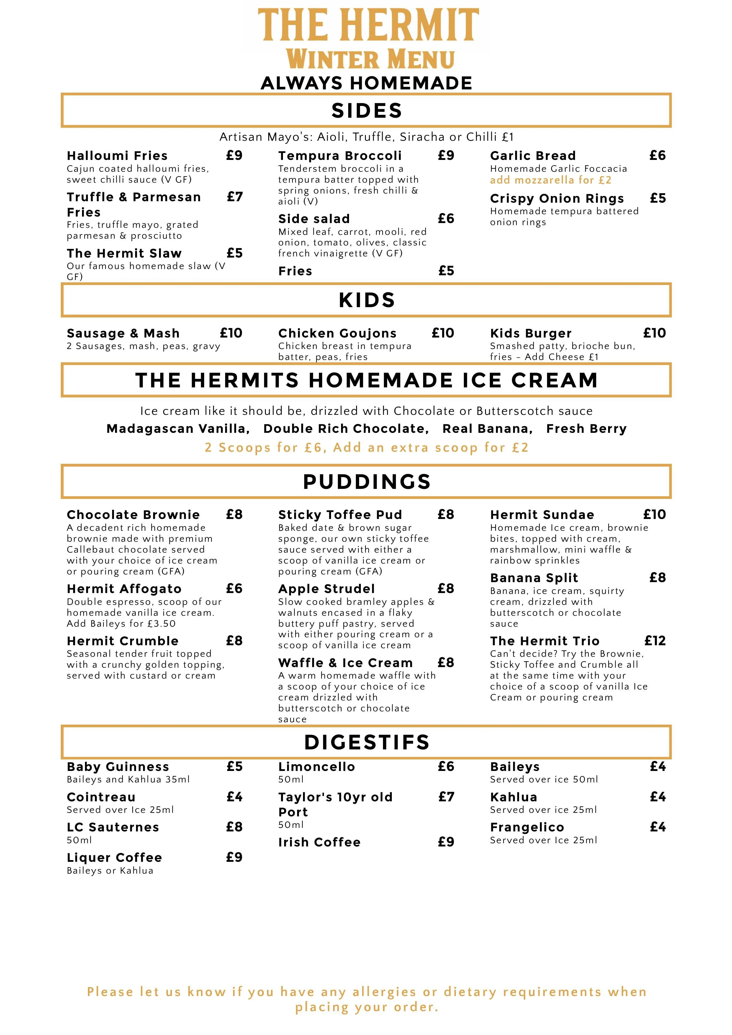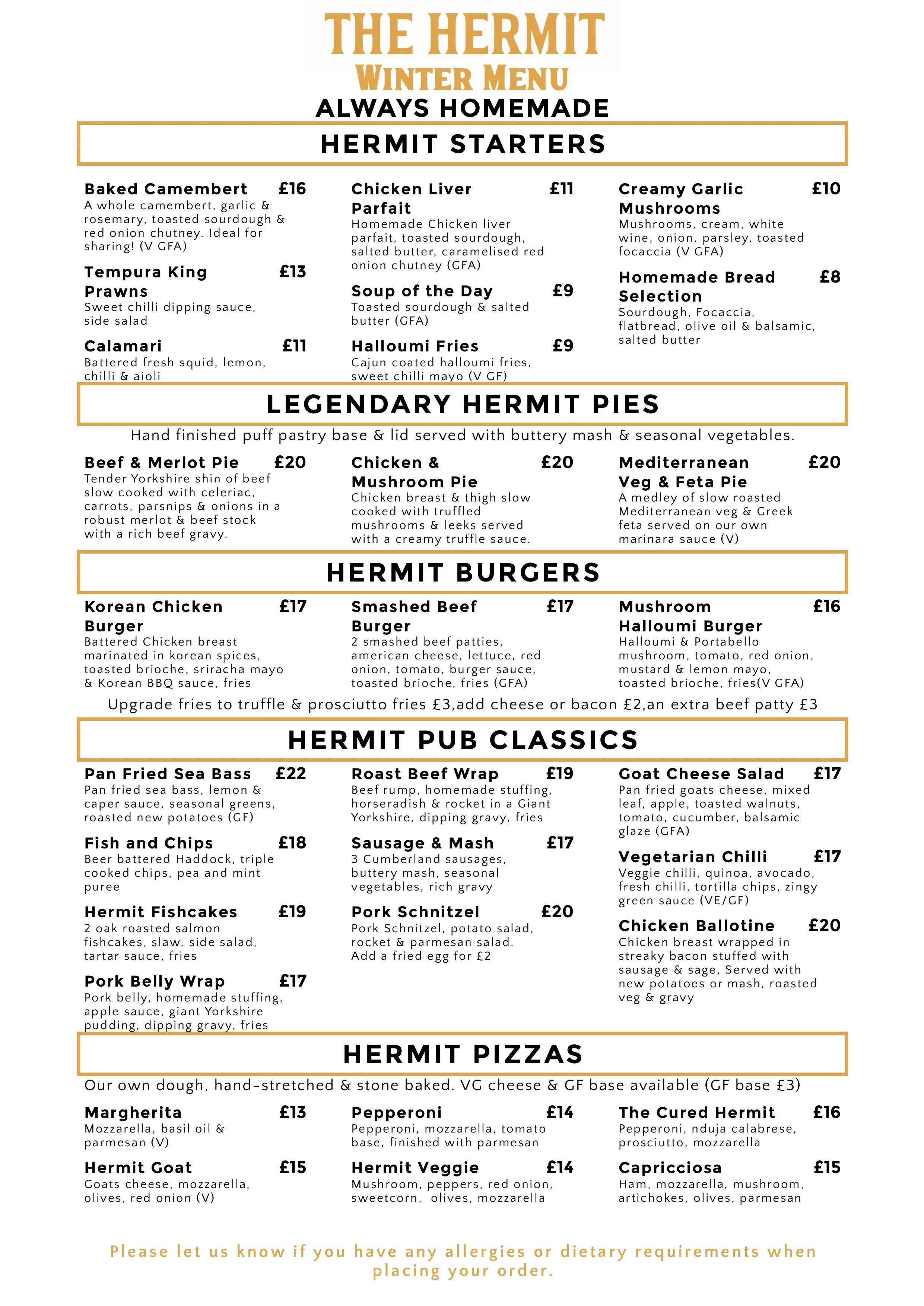 The Hermit menu is prepared fresh on site, including our legendary hand stretched stone-baked pizzas (made with our in house Hermit dough), our home made pies (wrapped in golden pastry) and a full range of delicious hot plates and sharing dishes, as well as light bites, sides and desserts.
