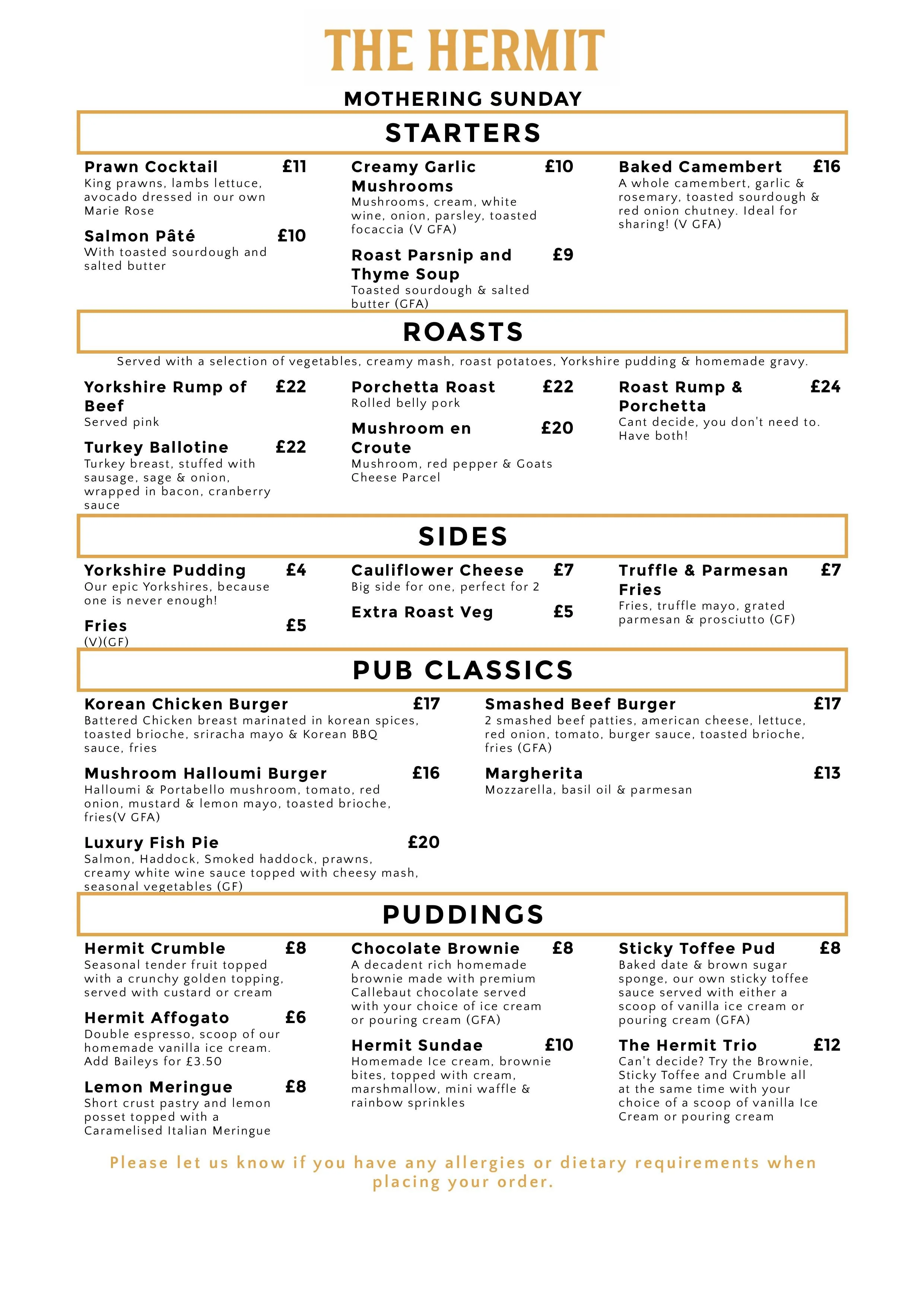Hearty roasts, all the trimmings, and a warm Hermit welcome, the perfect way to celebrate Mother’s Day